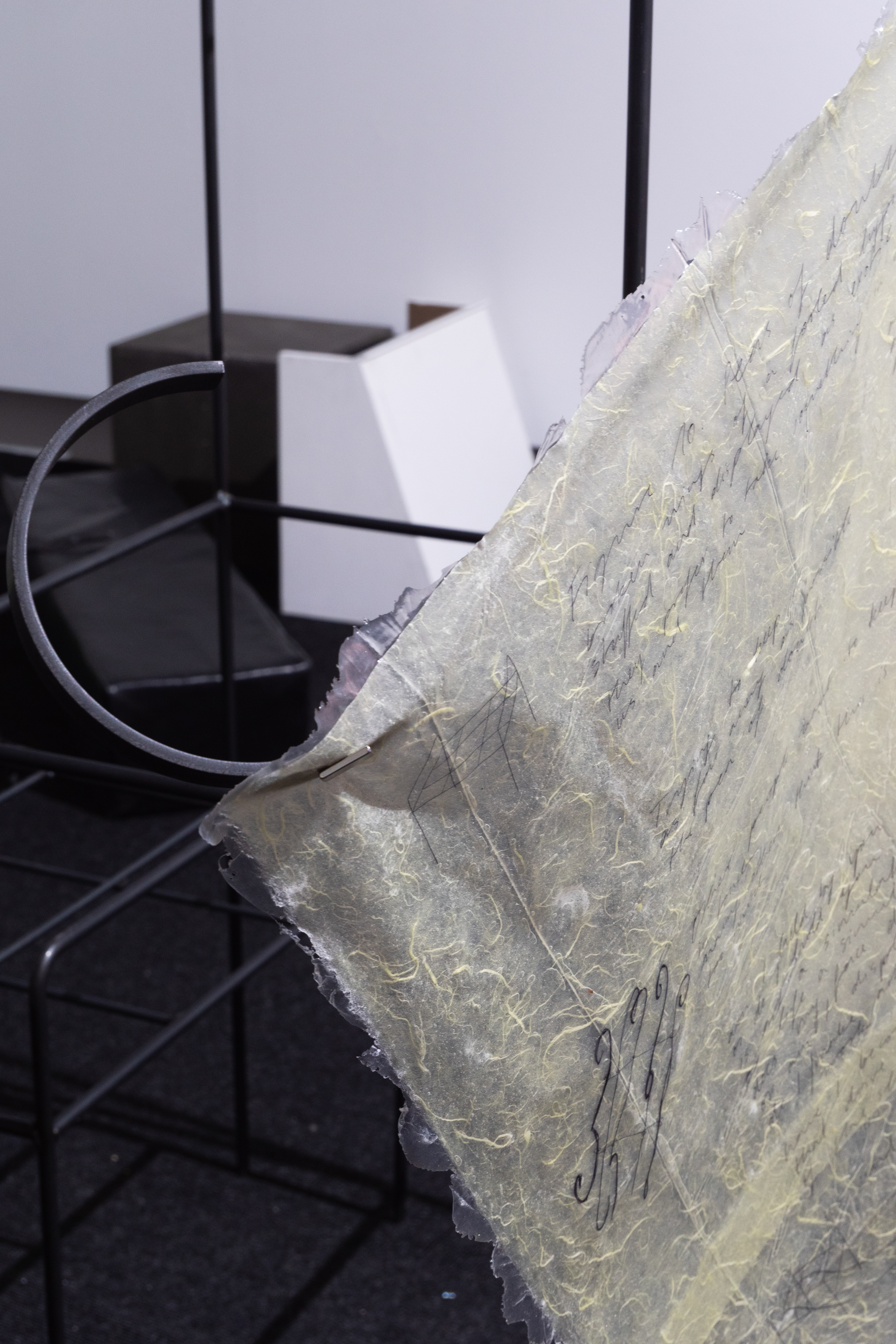 script and drawings on handmade paper with plant inclusions enclosed by silicone, PVC, building spotlights