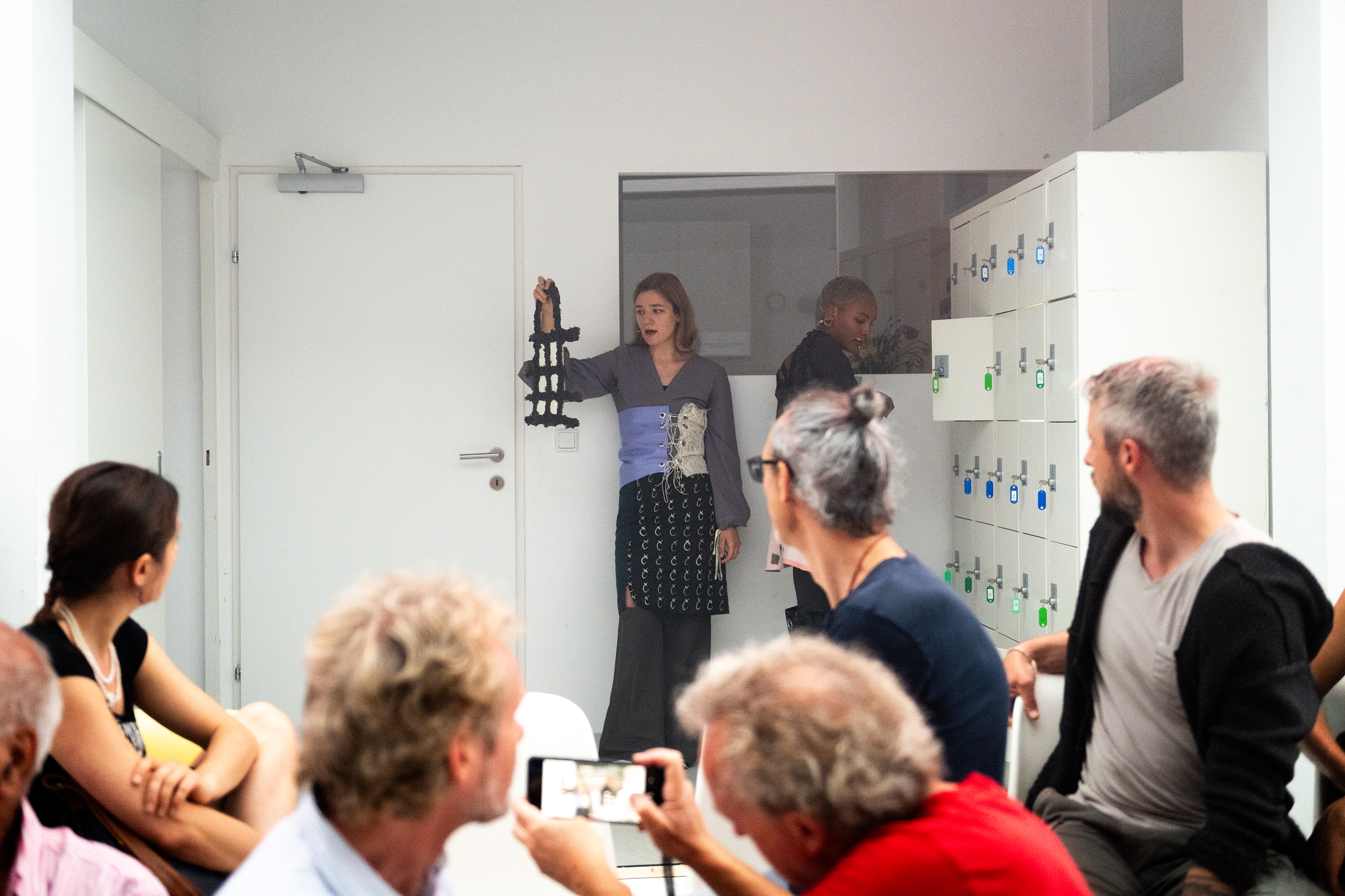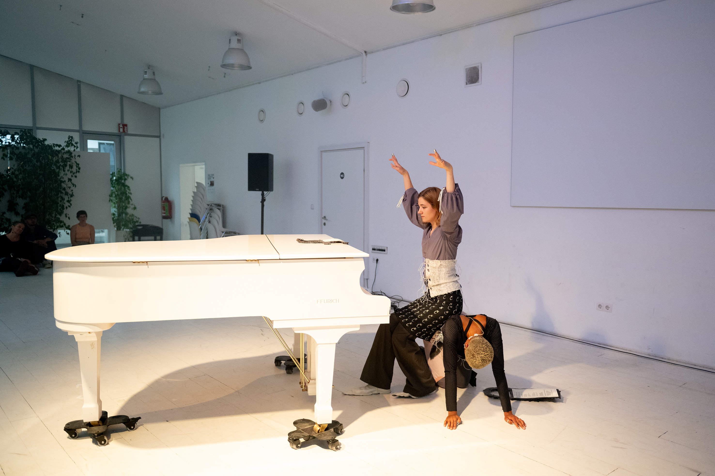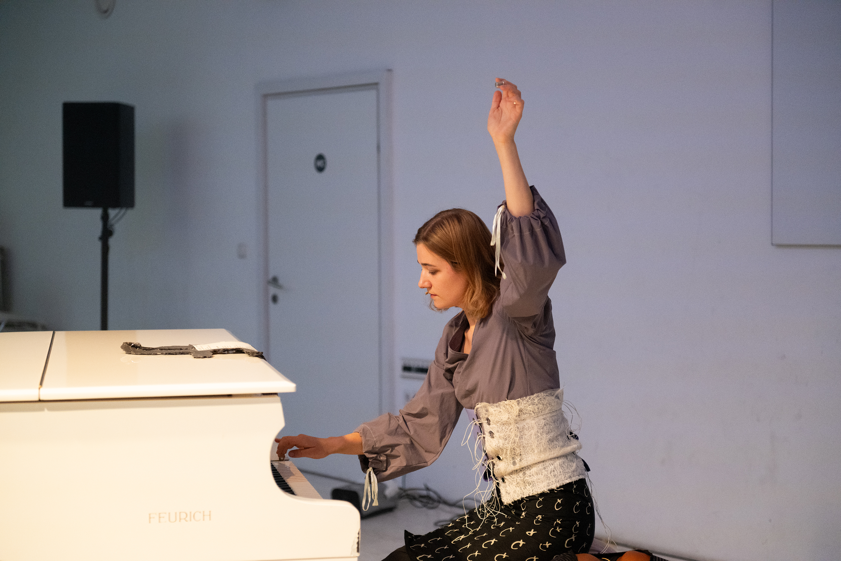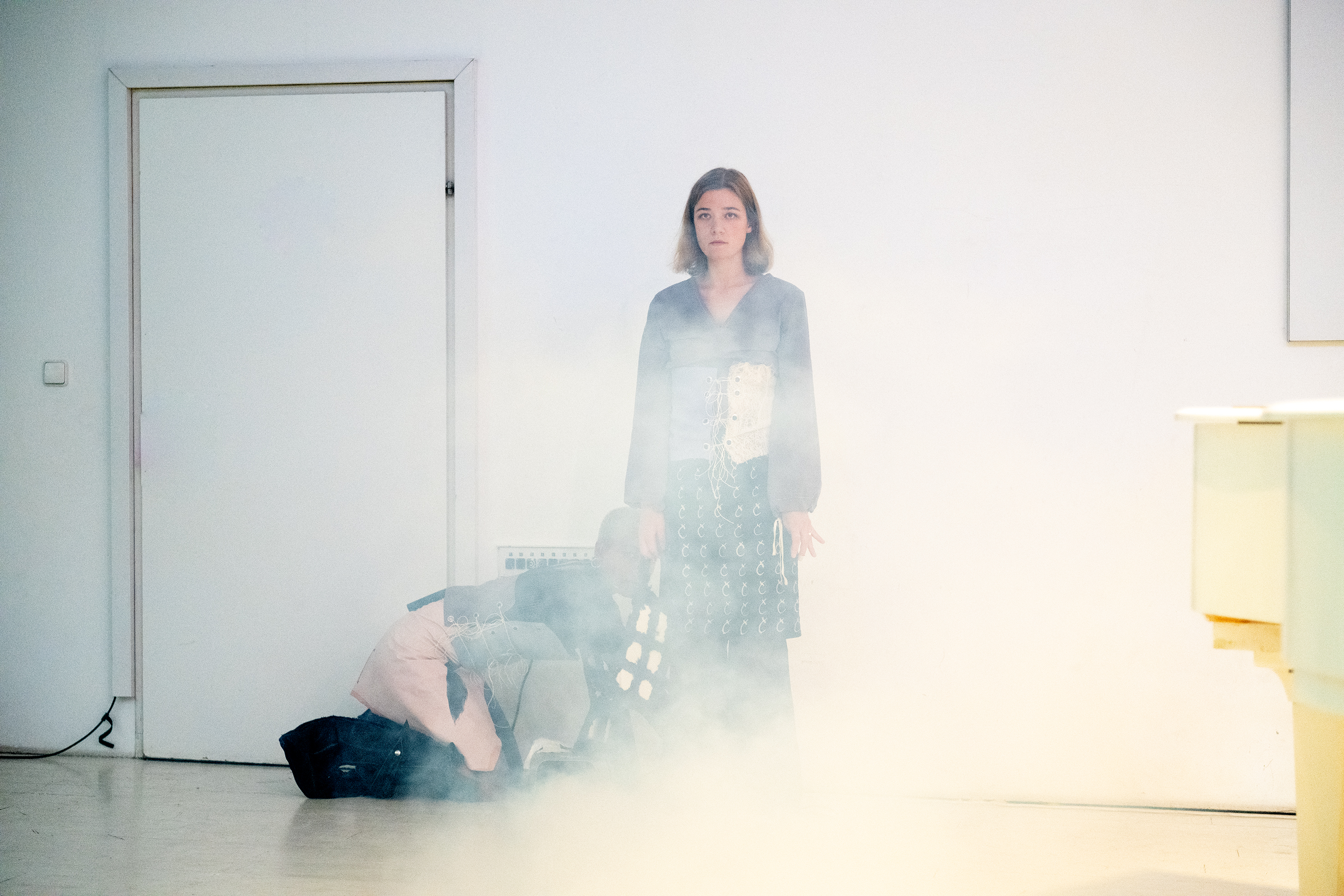 Player: leather, silicone, burrial soil, magnets, tulle, textiles, print on paper, text, piano on wheels, fog, sound